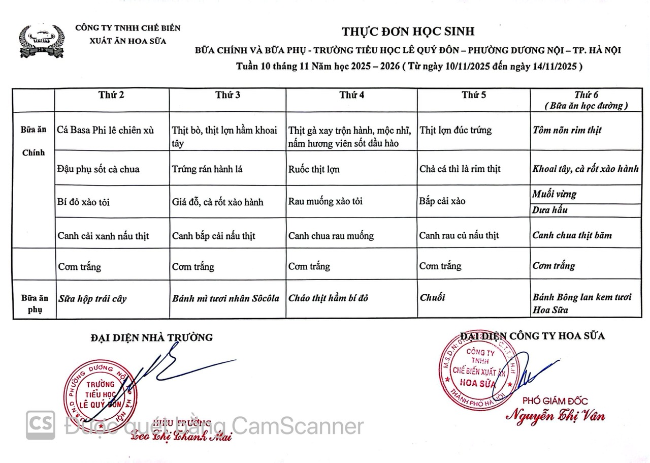 Thực đơn tuần 10 - Năm học 2015-2026