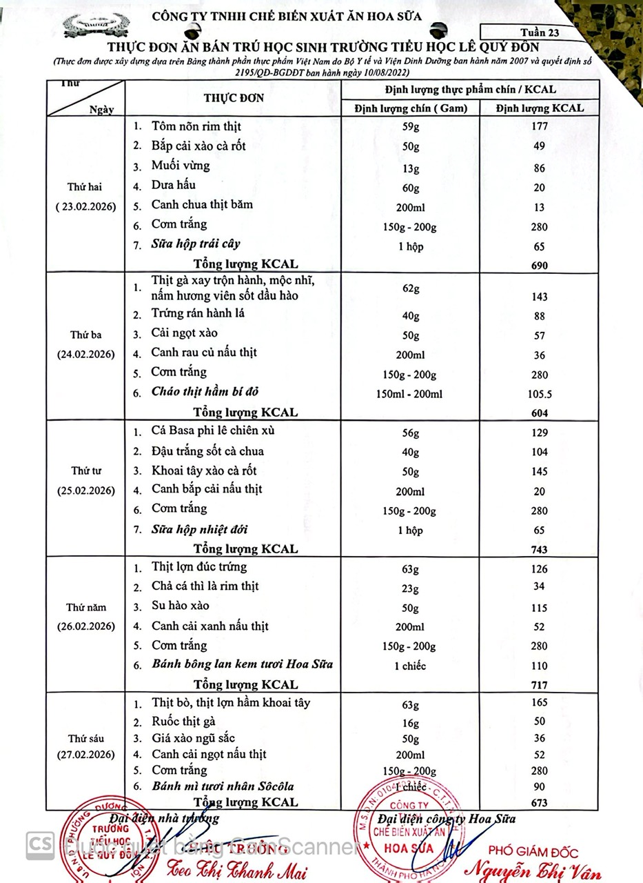 Thực đơn tuần 23- Năm học 2025-2026