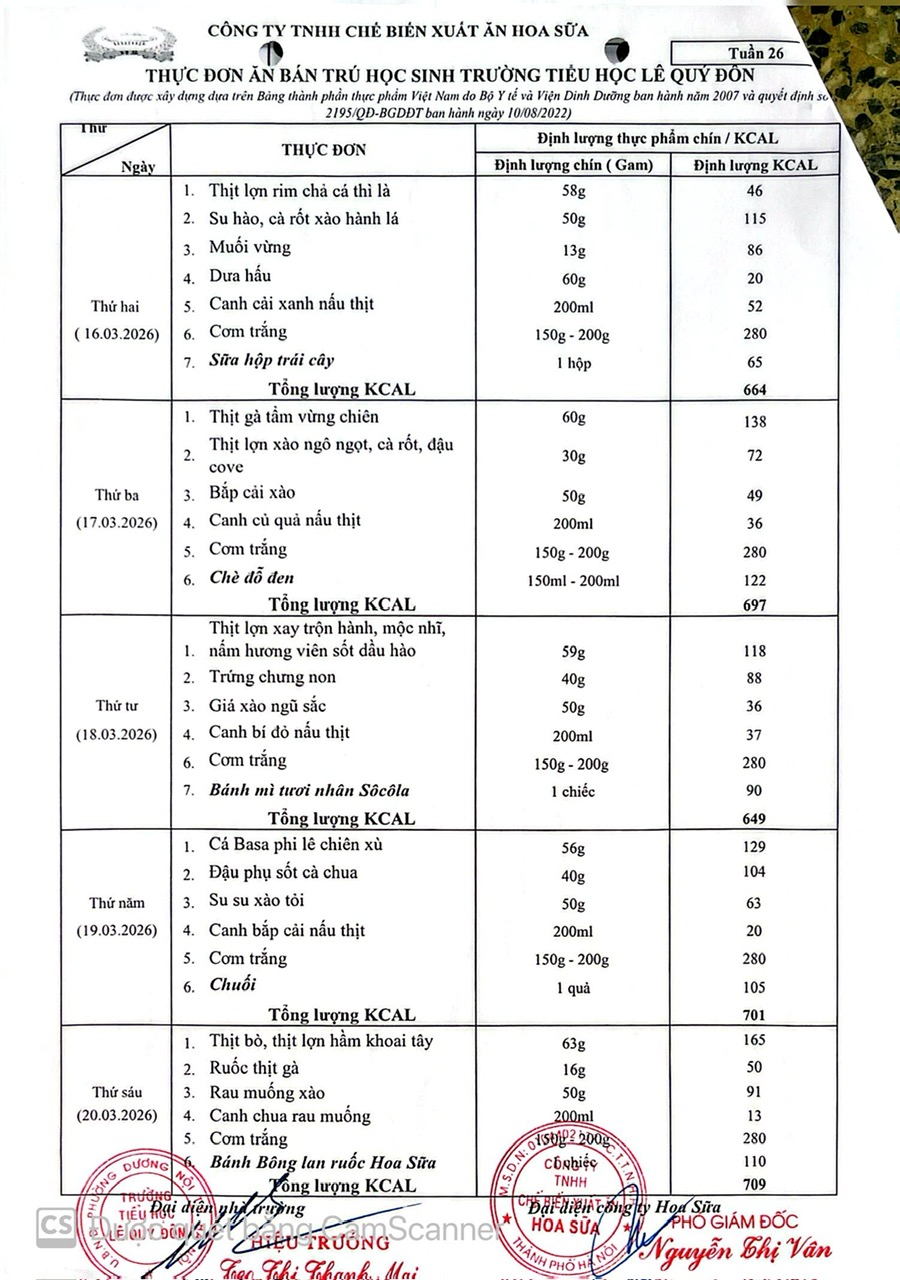 Thực đơn tuần 26- Năm học 2025-2026
