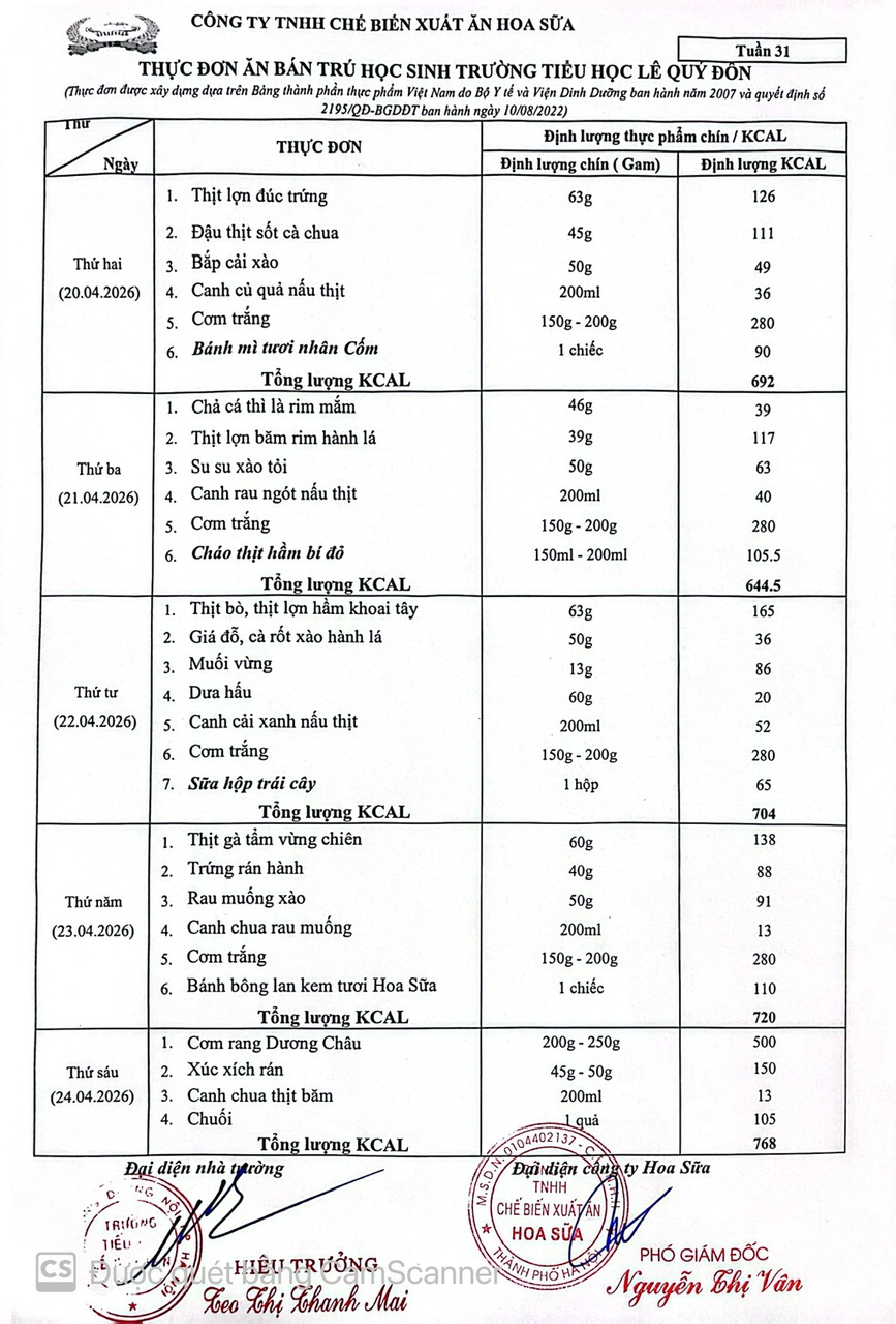 Thực đơn tuần 31- Năm học 2025-2026