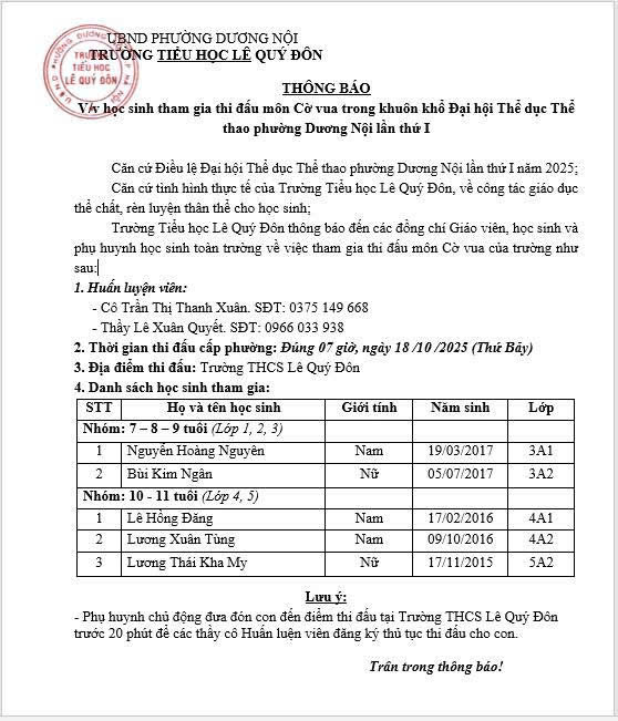 Xin chúc mừng các em và chúc cho phong trào thể dục thể thao của Trường Tiểu học Lê Quý Đôn ngày càng phát triển mạnh mẽ hơn nữa! 🌟