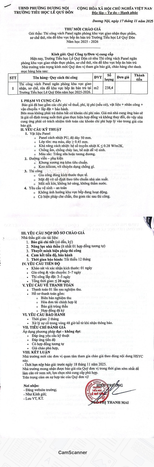 THƯ MỜI CHÀO GIÁ Gói thầu: Thi công vách Panel ngăn phòng khu vực giao nhận thực phẩm, sơ chế thô, rửa đồ khu vực bếp ăn bán trú Trường Tiểu học Lê Quý Đôn năm học 2025 - 2026