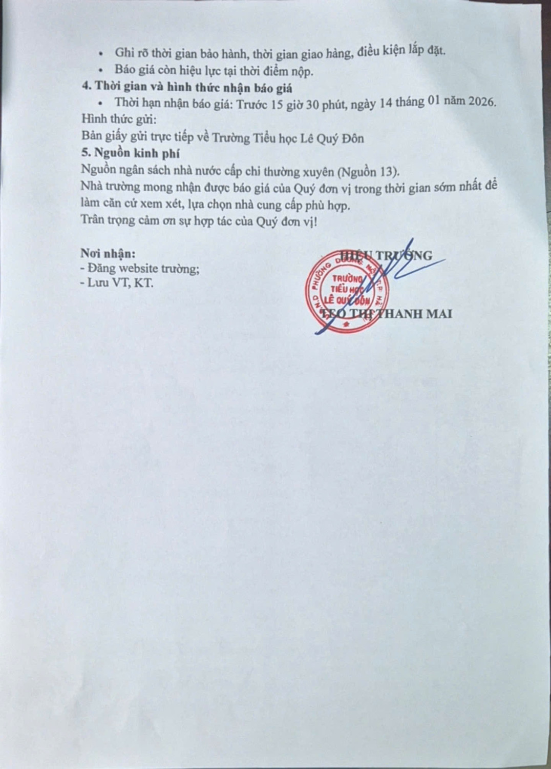 Thư mời chào giá về việc cung cấp máy chiếu, máy soi bài phục vụ công tác chuyên môn cho Trường Tiểu học Lê Quý Đôn năm học 2025 - 2026